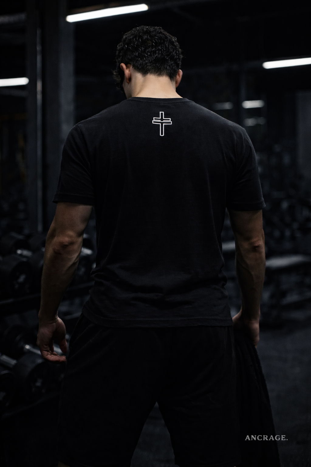 La coupe est droite et structurée, elle met naturellement en valeur les épaules, le torse et la carrure sans artifice. Un t-shirt conçu pour accompagner l’entraînement, le dépassement de soi et le quotidien de ceux qui exigent plus d’eux-mêmes.